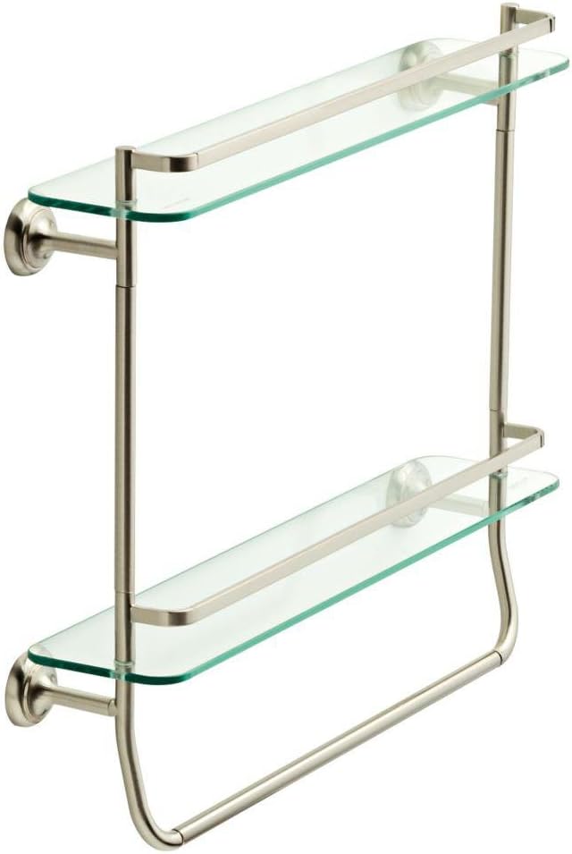 Glass shelf with double towel bar in spotshield brushed nickel.